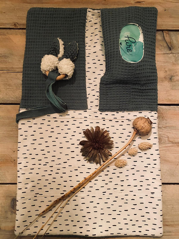 Het verschoningsmatje is een handig etui met opbergzakjes voor luiers, zalfje en vochtige doekjes aan 1 kant en een zacht kussen aan de andere kant. Verkrijgbaar met of zonder speeltje en in zelf gekozen kleuren natuurlijk.