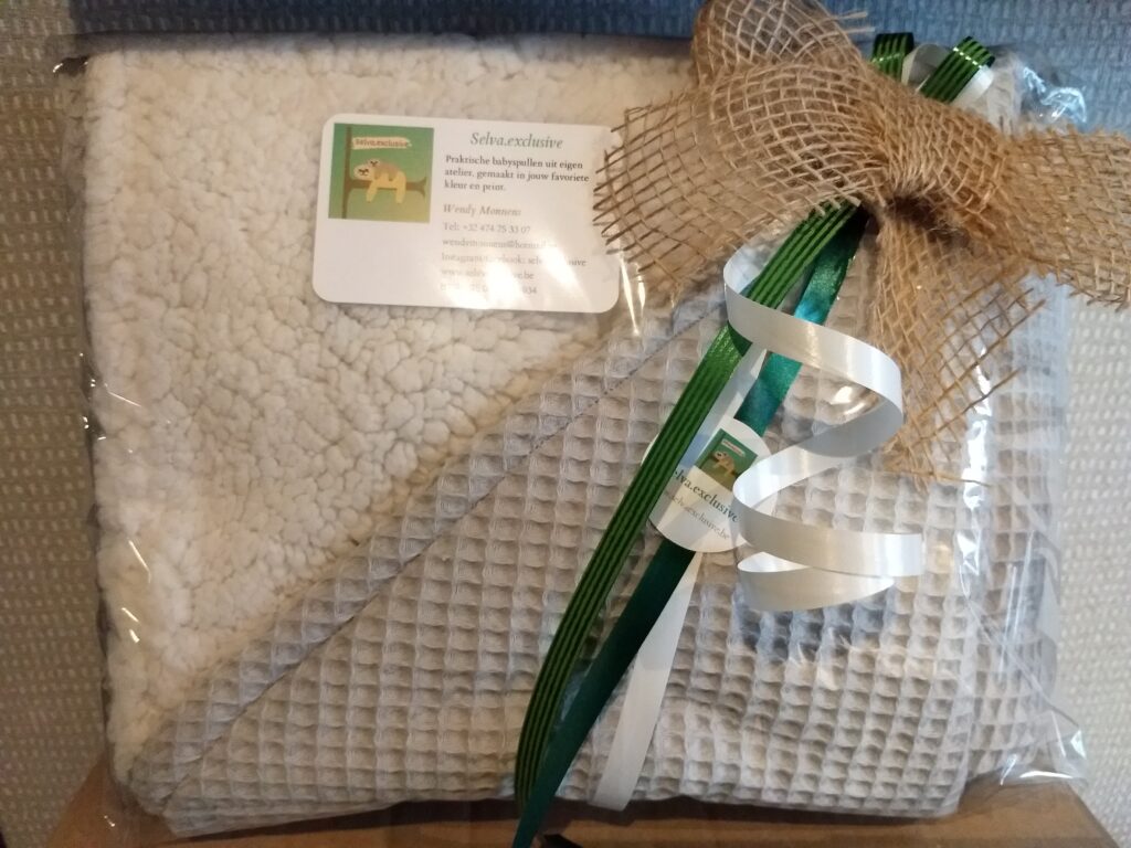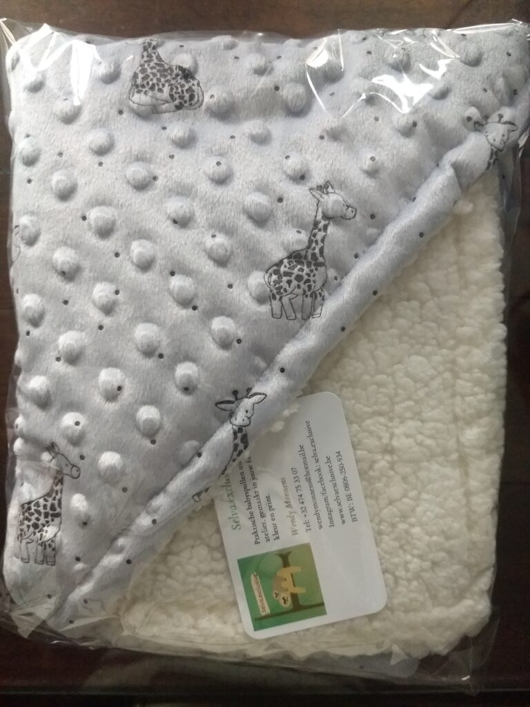 Het wiegdekentje met een grootte van 75cm x 100cm bestaat uit 2 zachte stoffen. De stoffen kan je zelf combineren. Op de foto een dekentje met teddy. €29,00